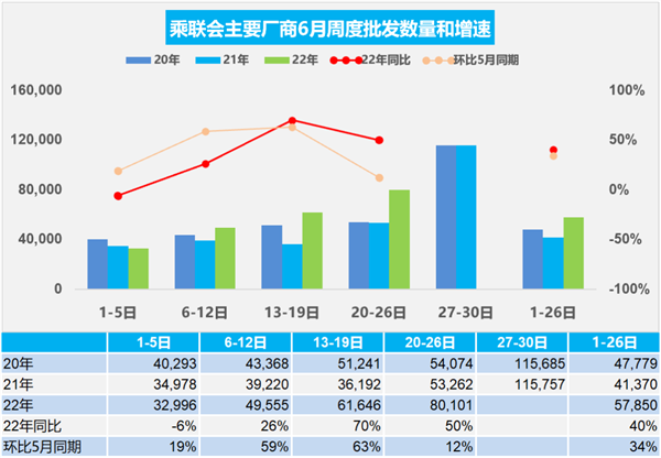6月1-26日全国乘用车厂商批发150.4万辆,同比去年增长40%(较上月累计同比增速提升49个百分点),环比上月同期增长34%。