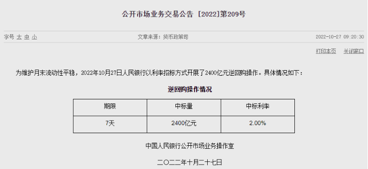 10月27日,人民银行发布公告称,央行以利率招标方式开展了2400亿元7天期逆回购操作,中标利率2.0%。根据Wind数据,当日有20亿元逆回购到期,故全天实现净投放2380亿元。自10月25日起,央行已累计实现净投放7440亿元。