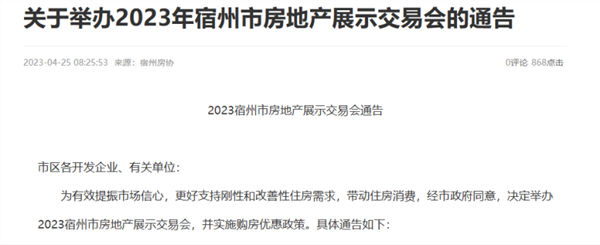 同日,安徽宿州房地产业协会发布公告称,将于4月29日至5月3日,举办2023宿州市房地产展示交易会,并实施购房优惠政策,其中,购市区首套新房、第二套新房,建筑面积在90平方米以上的,按照10000元/套标准发放消费券;建筑面积在90平方米及以下的,按照5000元/套标准发放消费券。