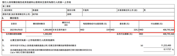 腾讯在港交所发布公告,当日耗资约4.01亿港元回购了120万股股份,每股成交价介于329.2港元至339港元之间。这已经是6月以来腾讯第4次回购,就在前一天,其耗资1.16亿港元回购了34.89万股。