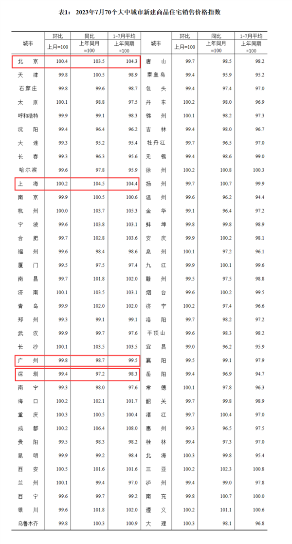 从新建商品住宅看,7月份,一线城市新建商品住宅销售价格环比连续两月持平,其中北京和上海环比分别上涨0.4%和0.2%,广州和深圳环比分别下降0.2%和0.6%。