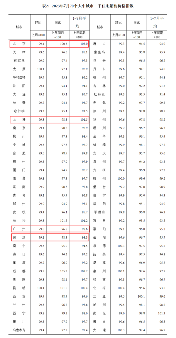 从二手住宅看,7月份,一线城市二手住宅销售价格环比下降0.8%,降幅比上月扩大0.1个百分点。四个一线城市的二手房价格均环比下降,广州、深圳分别环比下降1%、0.9%,北京、上海分别环比下降0.6%、0.7%。