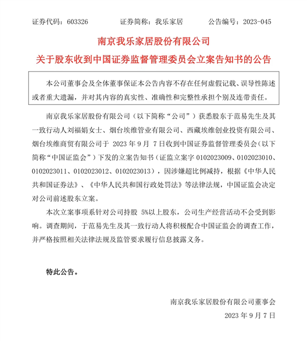 我乐家居表示,本次立案事项系针对公司持股5%以上股东,公司生产经营活动不会受到影响。调查期间,于范易及其一致行动人将积极配合中国证监会的调查工作,并严格按照相关法律法规及监管要求履行信息披露义务。