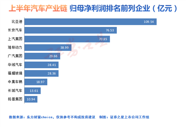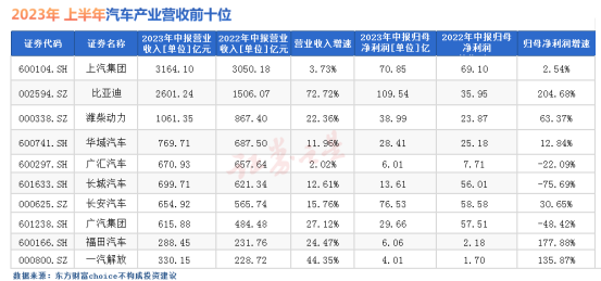 从营收规模看,A股市场中在营收上突破千亿元大关的整车企业是上汽集团和比亚迪。上汽集团上半年营业收入为3164.10亿元,同比增长3.73%,在车企中排名第一,但其归母净利润增速较小,且利润规模不及比亚迪。比亚迪上半年实现营业收入2601.24亿元,同比增长72.72%,实现归母净利润109.54亿元,同比增长204.68%。