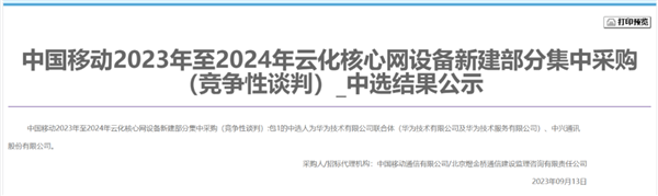 9月13日,中国移动公示2023年至2024年云化核心网设备新建部分集采(竞争性谈判)的中选结果,华为技术有限公司联合体(华为技术有限公司及华为技服务有限公司)、中兴通讯股份有限公司中标。中国移动此次集采产品为全国新建云化4/5G融合核心网、云化IMS核心网、虚拟化平台设置最高投标限价为722603万元(不含税总价),华为6814610869.83元(不含税),中兴应答报价为6729887142.35元(不含税)。