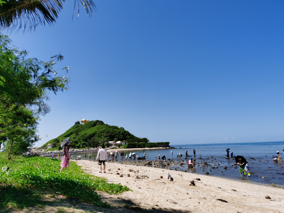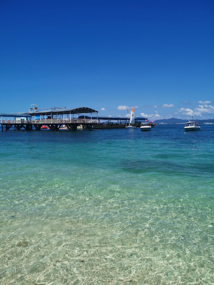后面我们又乘坐观光车回到了西岛中心广场,有美食街、白沙滩、椰林海岸等,可以吃一碗海鲜面,坐在海边椰树下感受海风、挖沙子,或者走到海边泡在海水里,感受海浪拍打着岸边,还可以看到有人在玩海上拖伞、帆船、水上飞龙、快艇、香蕉船等项目。基金君看到岛上快到中午时也是热闹非凡。