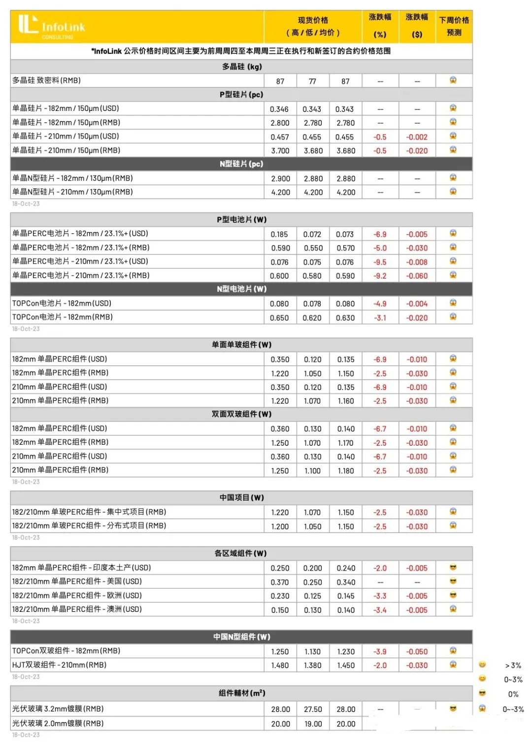 硅料价格进入买卖双方僵持和互相观望阶段,前期订单仍有部分在执行,但是陆续来到新单洽谈和签订周期,整体氛围日渐微妙。新单价格下跌预期明确,只是下跌幅度和速度的量化程度预计从下周开始才能更加明晰。