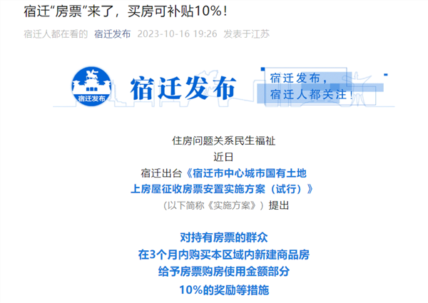 同日,宿迁还出台房票安置实施方案,提出对持有房票的群众在3个月内购买本区域内新建商品房给予房票购房使用金额部分10%的奖励等措施。