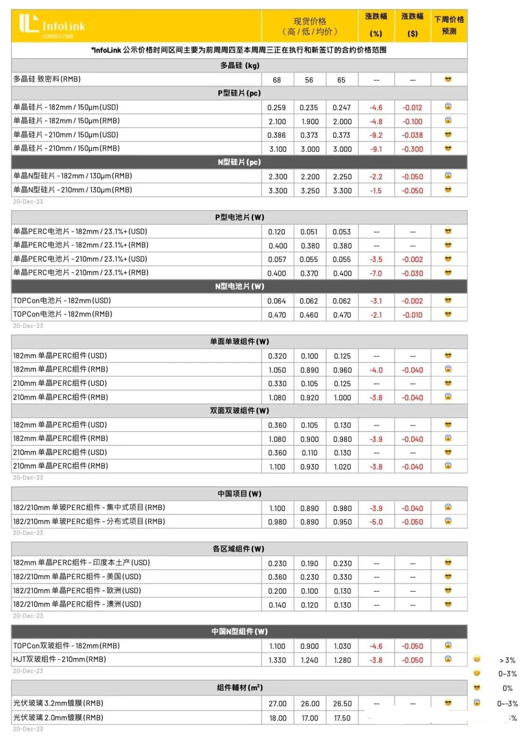 当前整体价格走势维持悲观,同时,电池厂家持续承受着低档的电池价格,当前在采购硅片上面临压力,本周观察电池环节减产幅度也持续提升,在年末拉货需求缓慢收缩的同时,硅片价格仍将视自身排产调整与否对应变化。