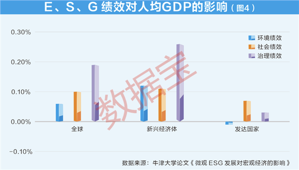 一是促进经济增长。牛津大学的学者研究结果显示,一国企业的ESG表现与该国人均GDP具有正向关系,环境、社会和治理因素评分每上升1个单位,将推动人均GDP分别上升0.06%、0.1%和0.19%,其中在发达和新兴经济体中,企业社会绩效对人均GDP的增长都有显著的积极影响,而环境和公司治理因素只对新兴经济体具有积极的影响,对发达国家的影响不显著(图4)。