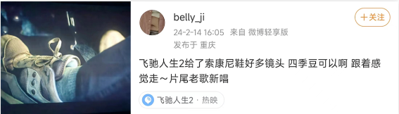 影片大热也带红了厉小海在片中所穿的索康尼经典鞋款Shadow 6000系列。有细心的网友发现隐藏彩蛋:《飞驰人生2》给了索康尼鞋好多镜头。