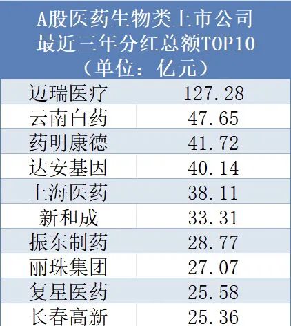 事实上,过去几年已有不少A股医药生物类上市公司进行了大笔分红。同花顺iFind金融数据终端显示,迈瑞医疗最近三年累计分红总额已超百亿元,另有云南白药、药明康德、达安基因三家超40亿元。