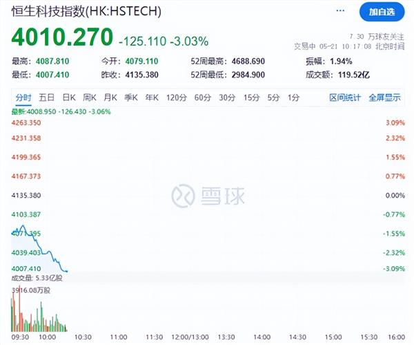 港股早间同样低开,盘中主要指数集体跳水,恒生指数跌2%,恒生科技跌超3%。