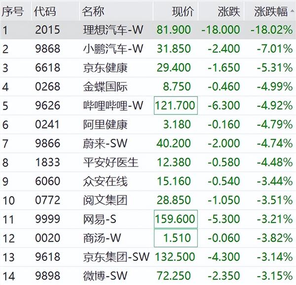 理想汽车大跌超18%,领跌恒生科技。