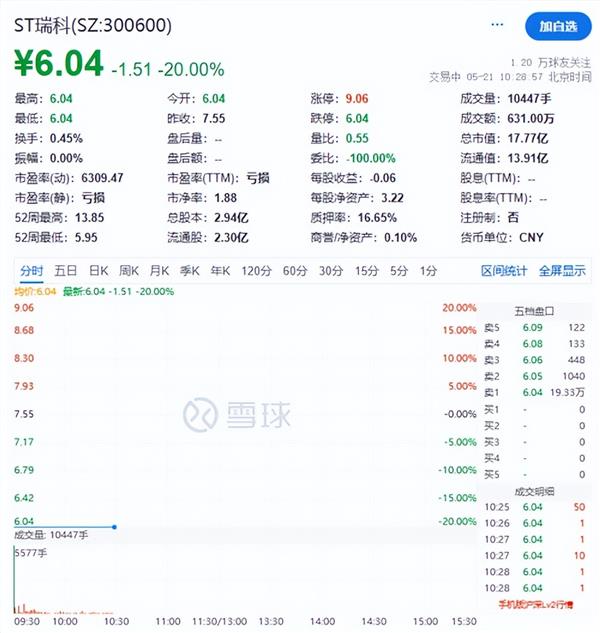 5月21日,国瑞科技简称变为“ST瑞科”,股价一字跌停。截至发稿,ST瑞科股价为6.04元/股,跌幅为20%;卖一封单超19万手。