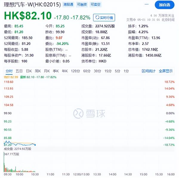 5月21日,港股理想汽车股价低开低走,盘中股价最低跌至81.2港元/股;截至发稿,跌近18%。