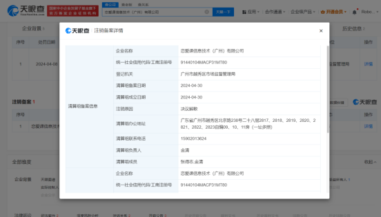 今年“3·15”晚会曝光恋爱课公司“把客户当成猎物”,收取高昂会员费。天眼查App显示,涉事公司恋爱课信息技术(广州)有限公司成立于2023年7月,注册资本100万人民币,由张得志、金清共同持股。行政处罚信息显示,该公司以虚假及引人误解的方式对提供的服务内容作宣传,被罚款56.2万元、没收违法所得3.4万余元。近日,该公司新增注销备案信息,注销原因为“决议解散”。此外,该公司近日因通过登记的住所或者经营场所无法联系,已被广州市越秀区市场监督管理局列入经营异常名录。