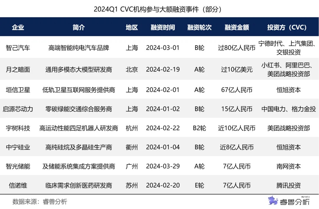 9起中国CVC参投的大额融资事件的已披露融资总额284.71亿元,融资金额占一级市场已披露大额融资事件总金额(1,153.81亿元)的24.7%。其中智己汽车、月之暗面和启源芯动力均有1家以上的CVC参与投资。