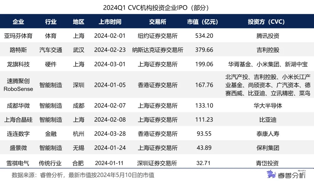 IPO企业CVC渗透率为23.2%。2024Q1,56家中国企业完成IPO,其中13家IPO企业共获得21家CVC的支持,吉利控股和比亚迪分别参投2家IPO企业。