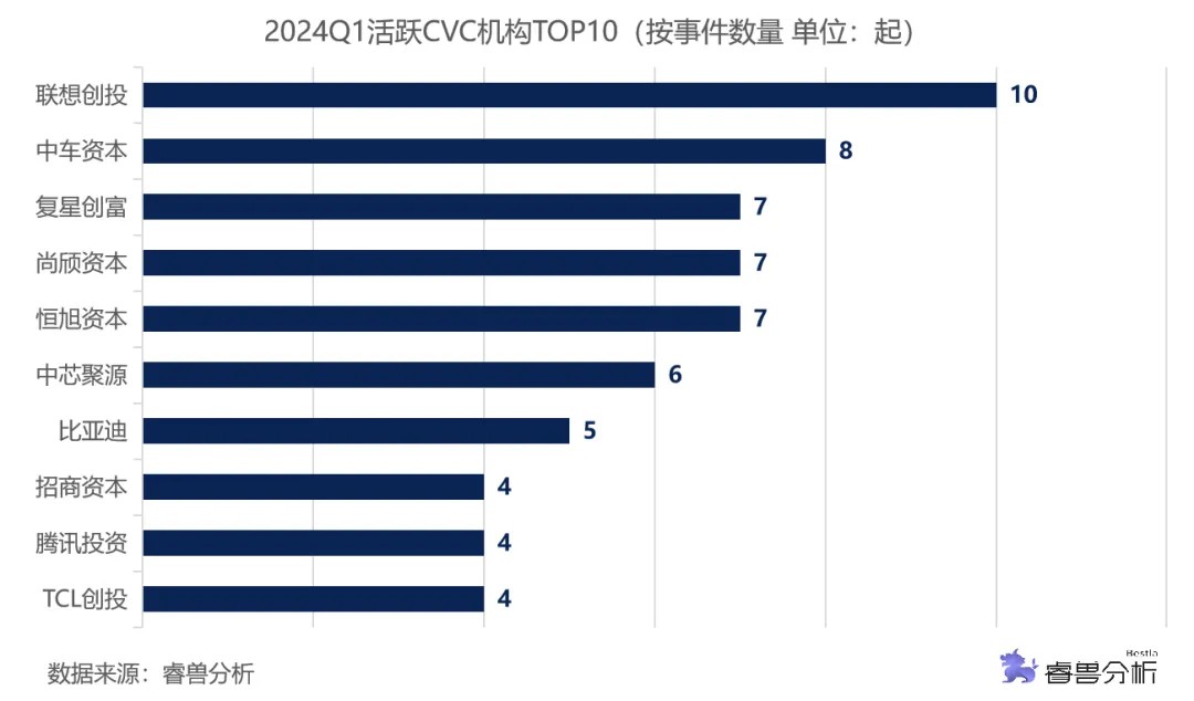 2024Q1参与一级市场投资的国内CVC机构有214家,从投资事件数量来看,投资活跃的国内CVC机构主要为联想创投、中车资本、复星创富、恒旭资本、尚颀资本等。