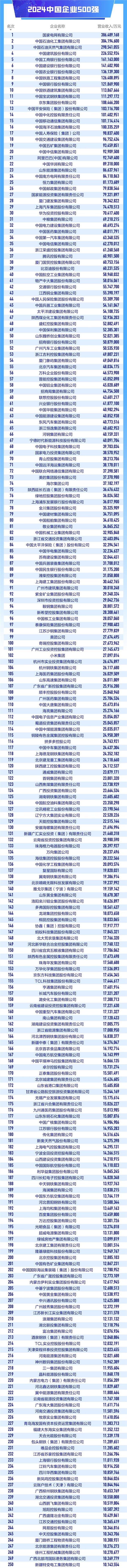 (原标题:中国企业哪家强?中国企业500强榜单:总体营业收入突破110万亿元大关(附完整榜单))