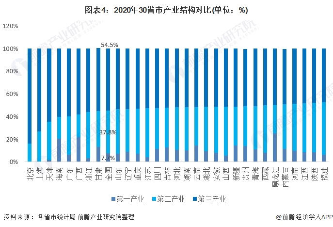 但从区域方面,仅有8个地区第三产业占比超过全国水平,其中北京、上海、天津、广东、浙江为经济发达地区(北京为83.8%、上海为73.1%);海南、广西、甘肃则为农牧业占比较高地区(工业不发达)。