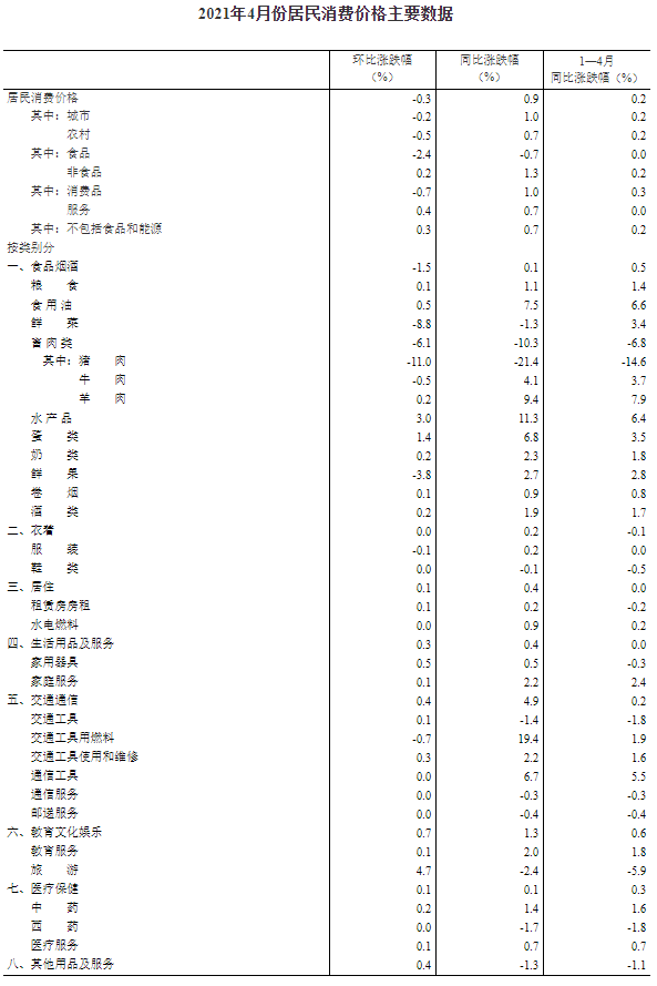 2021年4月份,全国居民消费价格同比上涨0.9%。其中,城市上涨1.0%,农村上涨0.7%;食品价格下降0.7%,非食品价格上涨1.3%;消费品价格上涨1.0%,服务价格上涨0.7%。1­­—4月平均,全国居民消费价格比去年同期上涨0.2%。