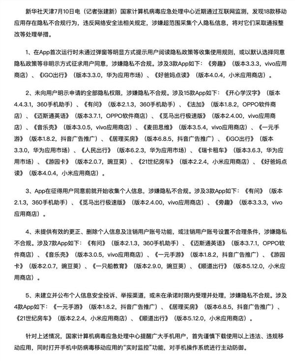 国家计算机病毒应急处理中心近期通过互联网监测,发现 18 款移动应用存在隐私不合规行为,违反网络安全法相关规定,涉嫌超范围采集个人隐私信息,将对它们采取通报整改等处理举措。