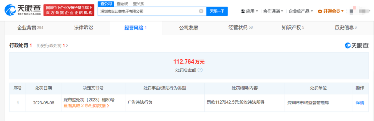 天眼查App显示,被晚会点名的兰山区和和网络文化传播工作室公司已于2023年04月04日注销。行政处罚信息显示,深圳市湘桂发科技有限公司分别于2023年10月19日、2023年11月29日因产品(商品)质量违法行为,被深圳市市场监督管理局龙岗监管局处以罚款、没收违法所得的处罚。深圳市琪艾美电子有限公司则因“广告违法行为”,被深圳市市场监督管理局罚款总计112.764万元,并没收违法所得。