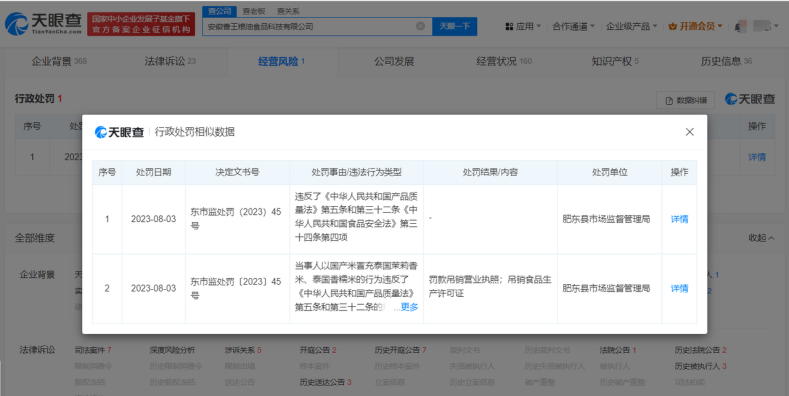 无独有偶,被曝光的安徽合肥市香王粮油食品科技有限公司受到了更严厉的处罚。天眼查经营风险信息显示,2023年8月,肥东县市场监督管理局对安徽合肥市香王粮油食品科技有限公司做出“罚款、吊销营业执照;吊销食品生产许可证”的行政处罚。因为添加香精,伪造“泰国香米”,一方面涉及超范围、超限量使用食品添加剂,另一方面涉及生产销售以假充真的产品,其情节相较于上述公司更为恶劣。