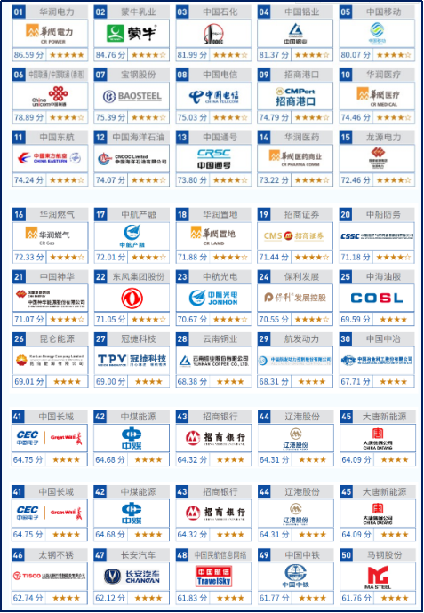 通过对ESG管治、社会价值和社会环境风险管理的综合评价,选出华润电力、蒙牛乳业、中国石化等50家上市公司,为国务院国资委统筹推动央企上市公司ESG工作提供参考。
