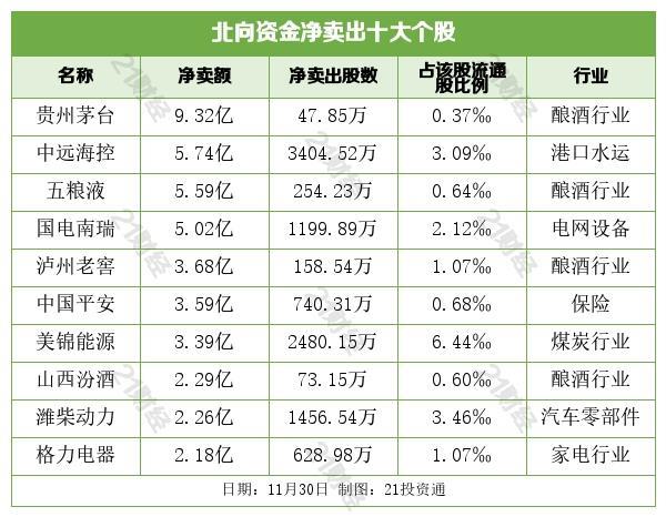 据21投资通(微信号ID:touzit21)智能监测,11月30日,北向资金净卖出34.11亿元,其中沪股通净卖出21.85亿元,深股通净卖出12.25亿元。