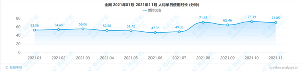 数据显示,截至2021年11月,我国婚恋交友行业APP活跃人数使用时长总和达9328.16万小时,环比下降3.19%;人均单日使用时长达71.05分钟。