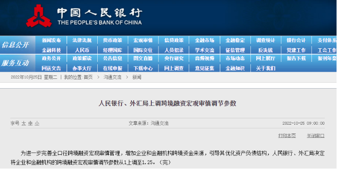 10月25日,人民银行发布公告称,为进一步完善全口径跨境融资宏观审慎管理,增加企业和金融机构跨境资金来源,引导其优化资产负债结构,人民银行、外汇局决定将企业和金融机构的跨境融资宏观审慎调节参数从1上调至1.25。