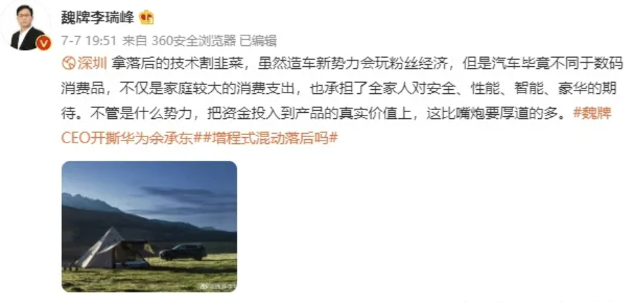 这一风格也体现在发布会上,魏派CEO李瑞峰不仅在发布会上称自己的DHT混联技术是“全球最好的新能源技术”,而且还说“DHT混联技术可以对蔚小理实现吊打”。