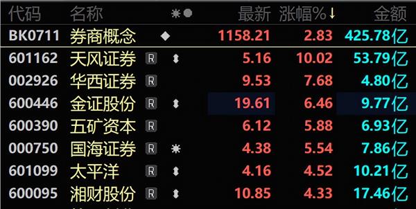 “牛市旗手”券商股异动拉升。天风证券涨停,华西证券、金证股份、五矿资本、国海证券等个股涨逾5%。